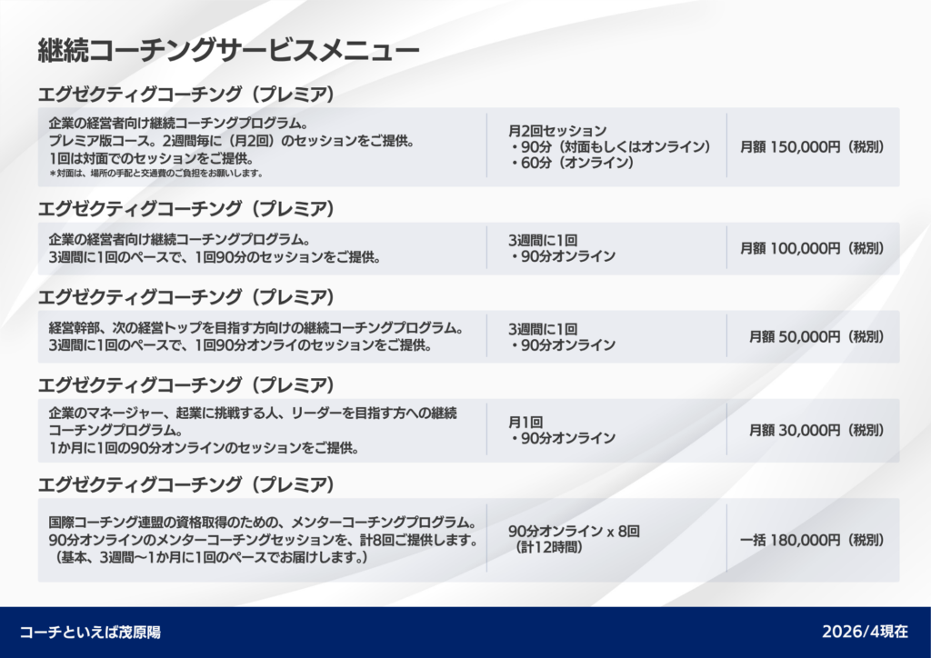 企業のマネージャー、起業に挑戦する人、リーダーを目指す方への継続コーチングプログラム。